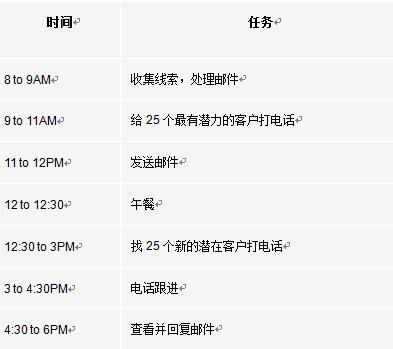 现在完全按照这个计划做就比较麻烦了。当然,有手头的事情要处理时是可以理解的,但还停留在这死板的计划上将是你经历的*艰难的事情。你的思维要跳出你的计划外,想想其他人是怎么做的。每个人都在做着同样的事情,发邮件,打电话等等。